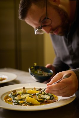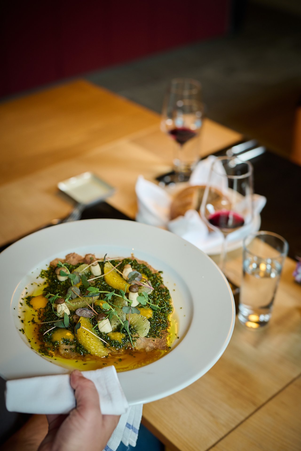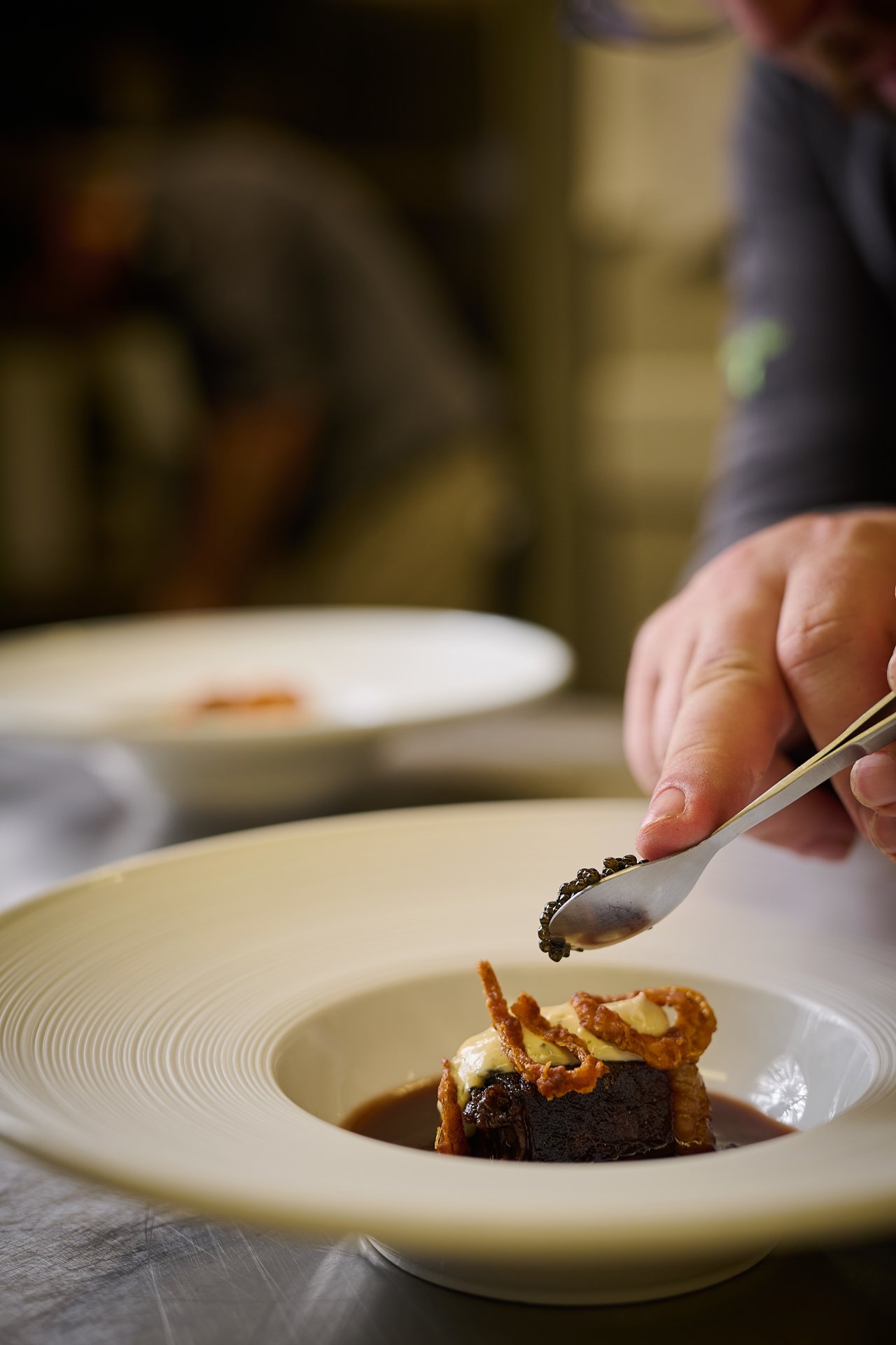 Während Manuel das Fleisch in feine Scheiben schneidet, gibt er zu, dass es etwas ungewohnt ist, für dieses Gericht Wagyu zu verwenden, aber «ich habe es ausprobiert und war sofort Fan davon. Es bleibt viel saftiger und macht sich in Kombination mit der Kräutervinaigrette [hergestellt aus der Flüssigkeit des Garsuds und verschiedenen eigenen Gartenkräutern] und den mit Zucker abgeflämmten Zitrusfrüchten einfach fantastisch.» Zudem provoziere er auch mal gern, indem er absichtlich etwas versalze oder etwas roh lasse.